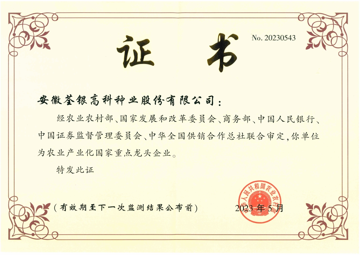 安徽荃銀高科種業(yè)股份有限公司是一家“以種業(yè)為核心、農業(yè)服務為延伸、探索和創(chuàng)新農業(yè)多元化發(fā)展”的現(xiàn)代高科技種業(yè)上市公司,證券代碼:300087。公司注冊資金9.47億元,系“中國種業(yè)領軍企業(yè)、農業(yè)產業(yè)化國家重點龍頭企業(yè)、國家高新技術企業(yè)、農業(yè)部首批農作物種子育繁推一體化企業(yè)、中國種業(yè)信用明星企業(yè)"。在國內控股子公司20多家,在國外設立分支機構4家,良種銷售至全國20多個省(市、區(qū)),出口覆蓋20多個國家與地區(qū),種業(yè)綜合實力、雜交水稻研發(fā)、推廣及海外業(yè)務規(guī)模均居全國種子企業(yè)前2位。